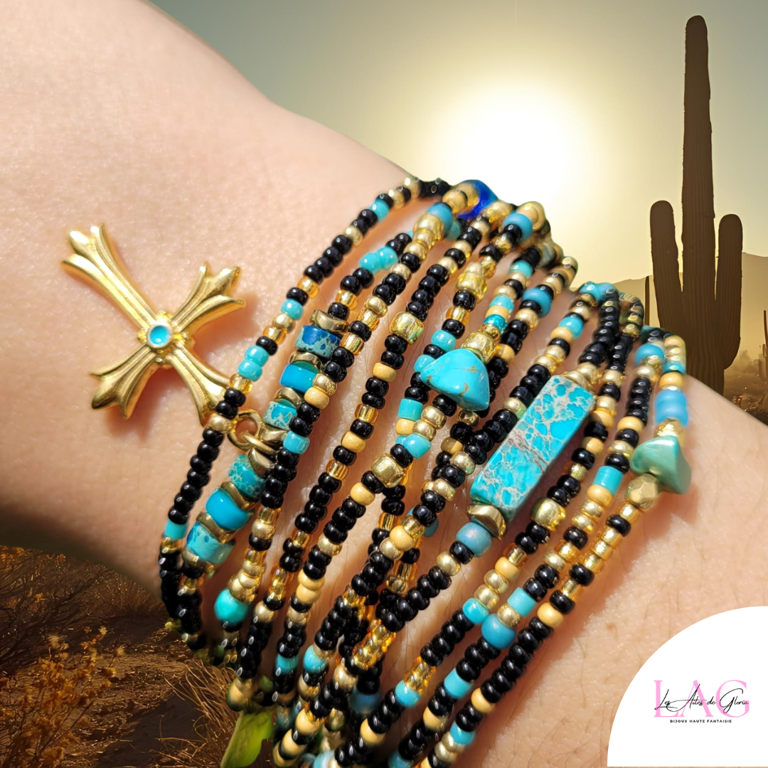 Pendentif Croix doré à l’or fin , perles de TURQUOISE, Hématites , perles gold doré 24K….