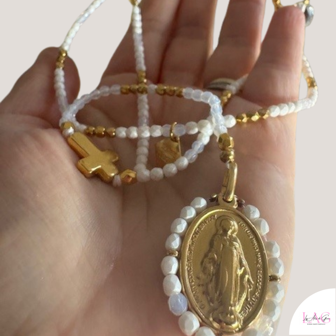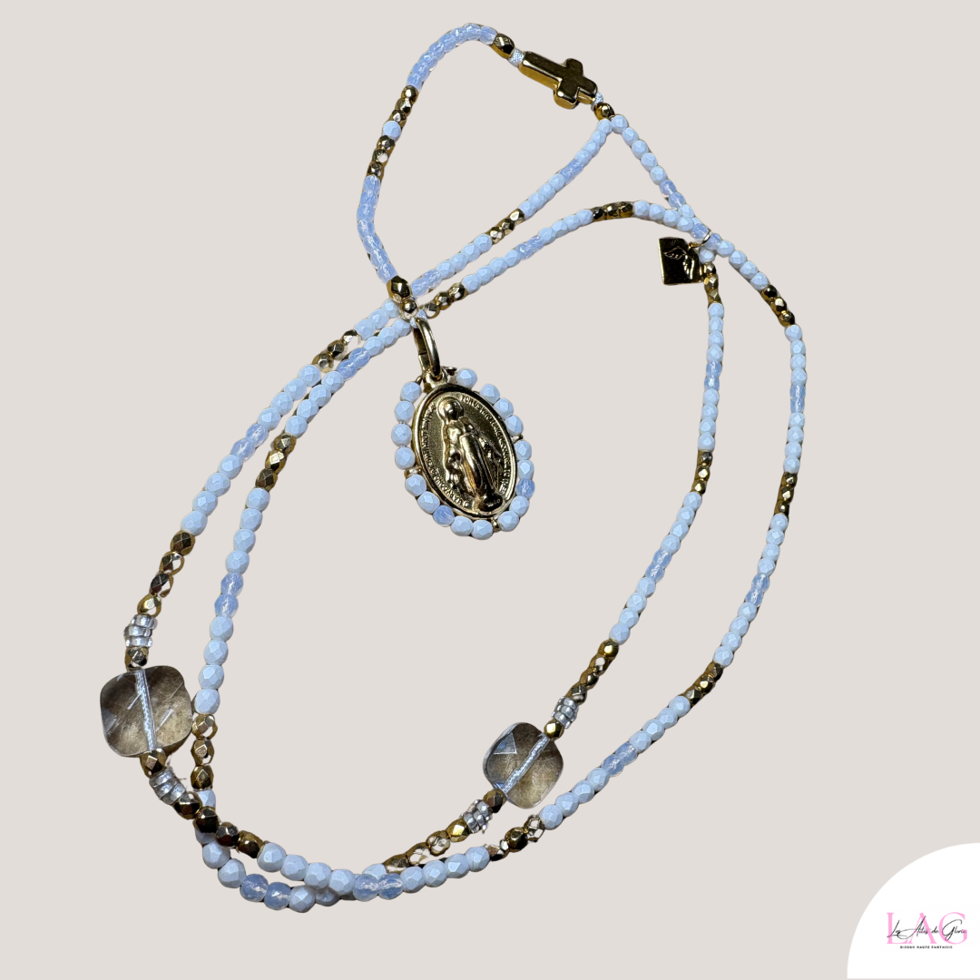 Des facettes square crystal sont également présent, une croix centrale doré à l’or fin, nous terminons cette merveille par une médaille en acier inox *Maria* enrichie de perles facettes assemblée par nos soins à l’atelier.
