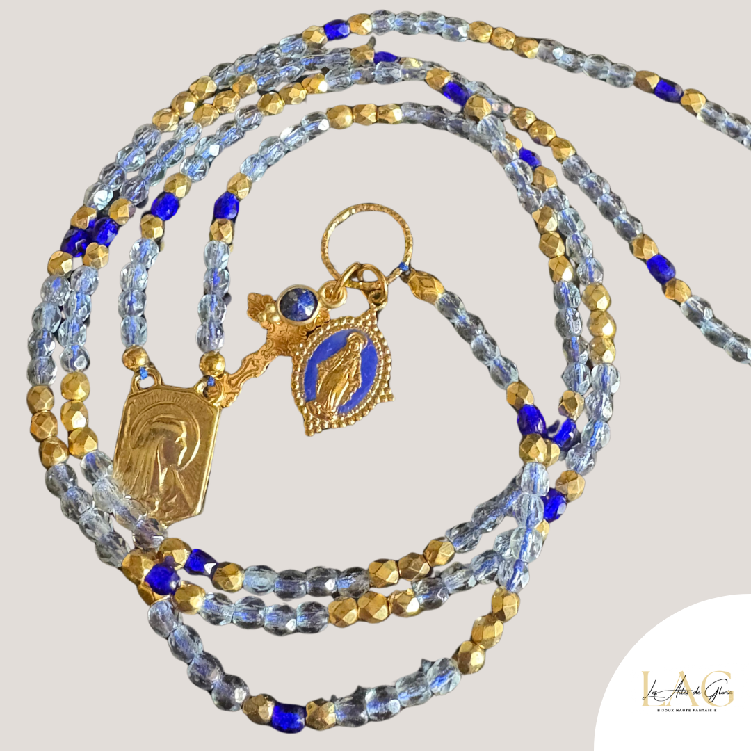 Composé de perles de verre facettés bleu ciel , bleu roy, gold effet 24k, nous terminons cette merveille par une croix gravée d’arabesque en argent doré à l’or fin, d’une médaille sainte en acier inoxydable et epoxy et de sa pierre facettée en Lapis lazuli