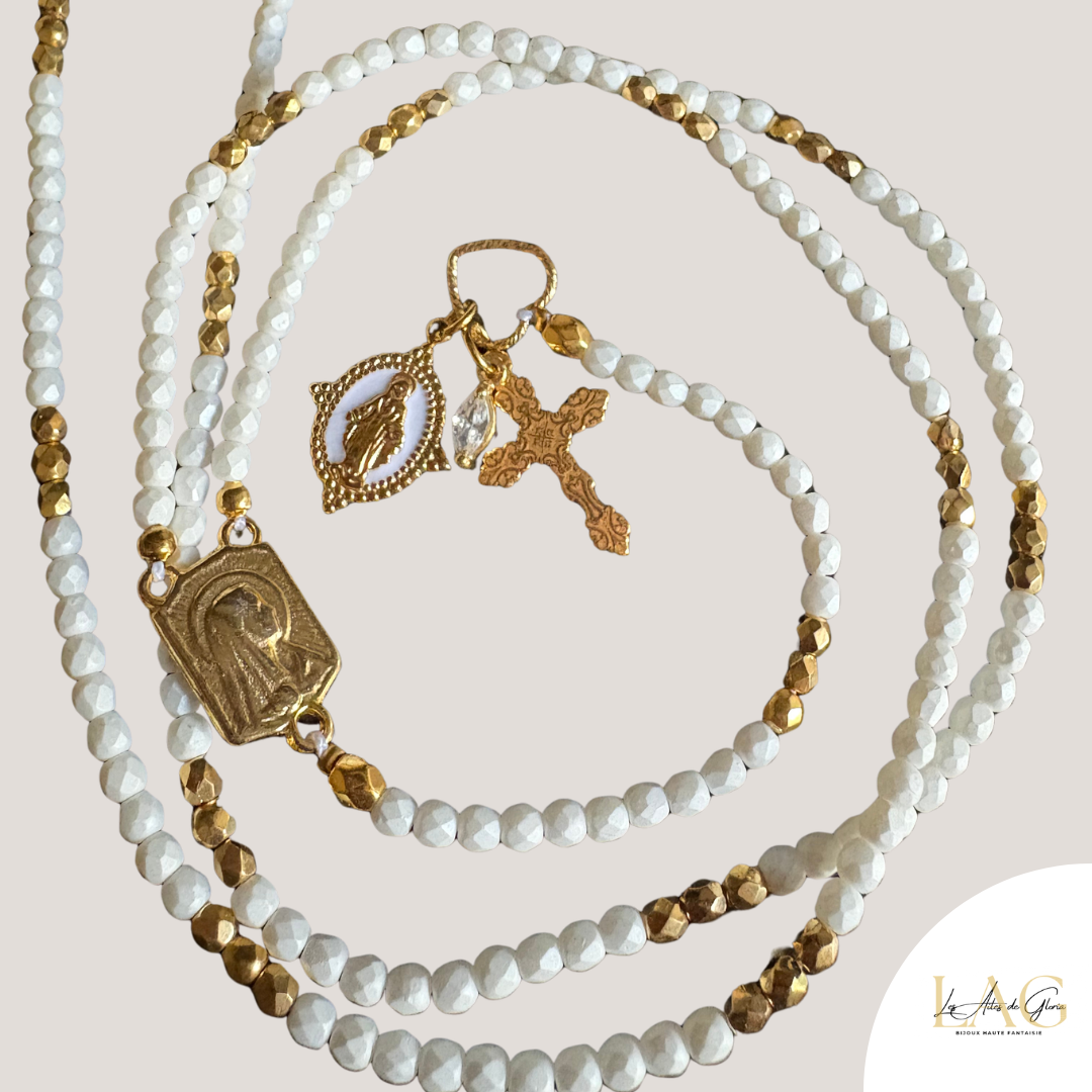 Composé de perles de verre facettés blanche mat, gold effet 24k, nous terminons cette merveille par une croix gravée d’arabesque en argent doré à l’or fin, d’une médaille sainte en acier inoxydable et epoxy et de sa pierre zircon crystal