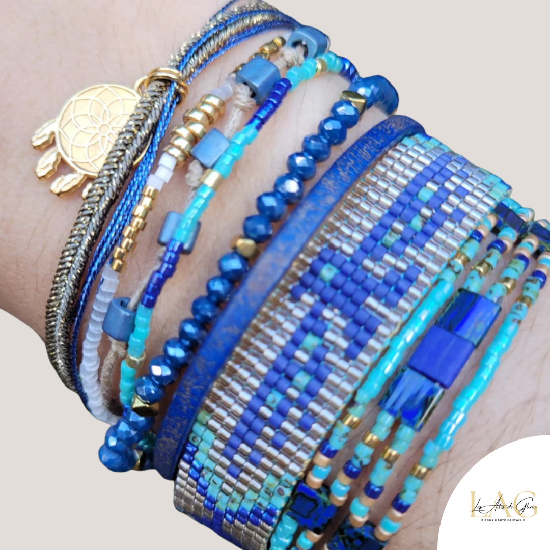 Cette magnifique manchette se compose de 3 liens (2 de 11mm) (1 de 20mm): Des perles de verres de bleues , perles tila ,