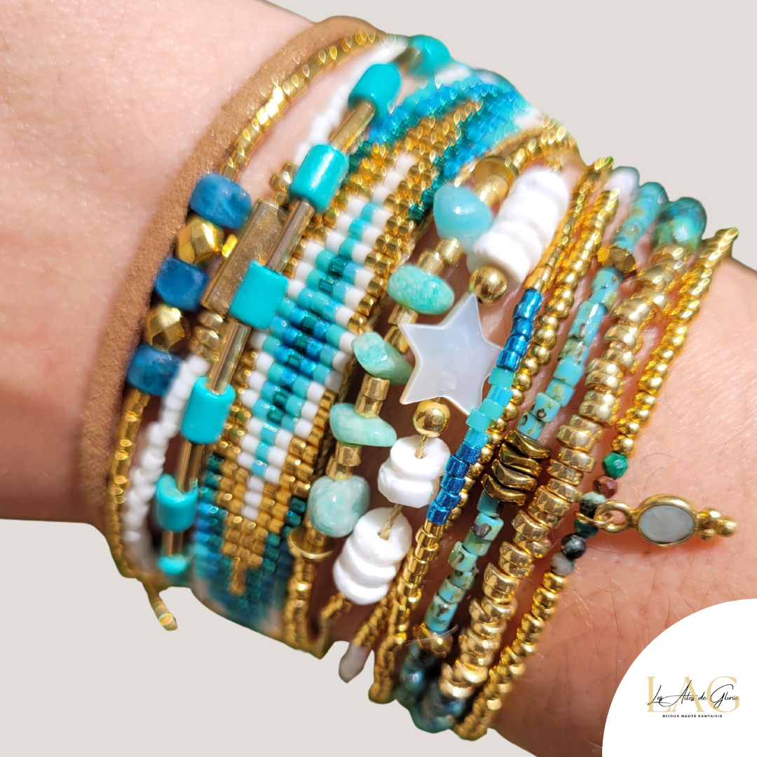 Cette magnifique manchette se compose de 4 liens de 11mm: Des perles Africaine, de l’Amazonite, des apatites bleu, Hématite doré, nacre, perles, breloque en plaqué or… & pampille en amazonite