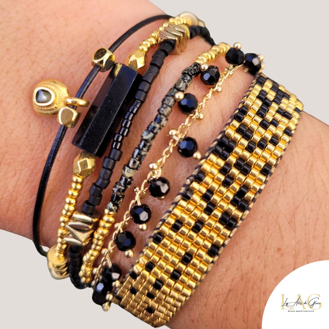 Cette magnifique manchette se compose de 2 liens de 11mm: Des perles d’Onyx, Chainette avec pampilles d’Onyx, des Hématites doré, perles, breloque en plaqué or…