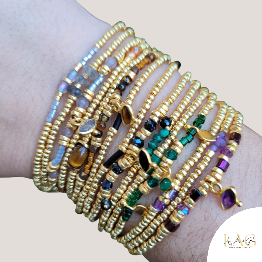 Ensemble monté sur fil en silicone élastique résistant et adaptable à tous les poignets. Entièrement fait à la main